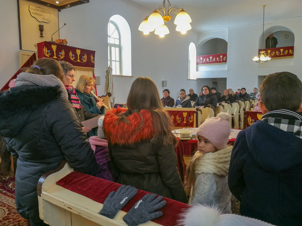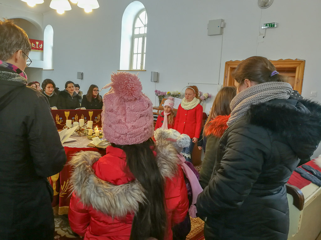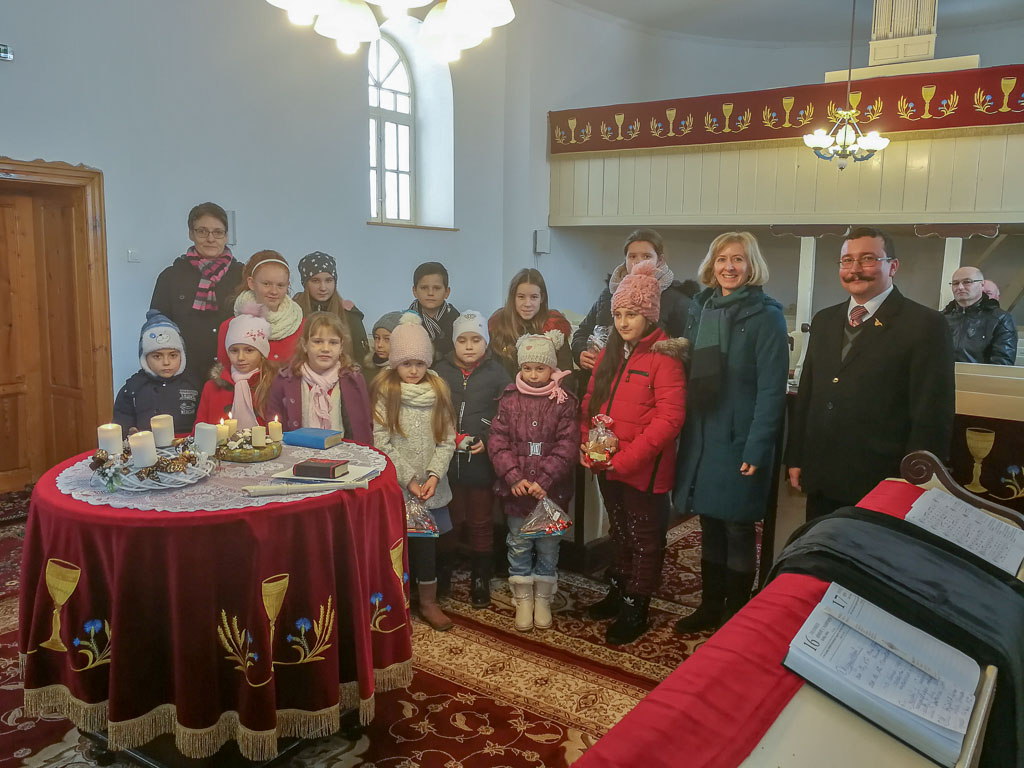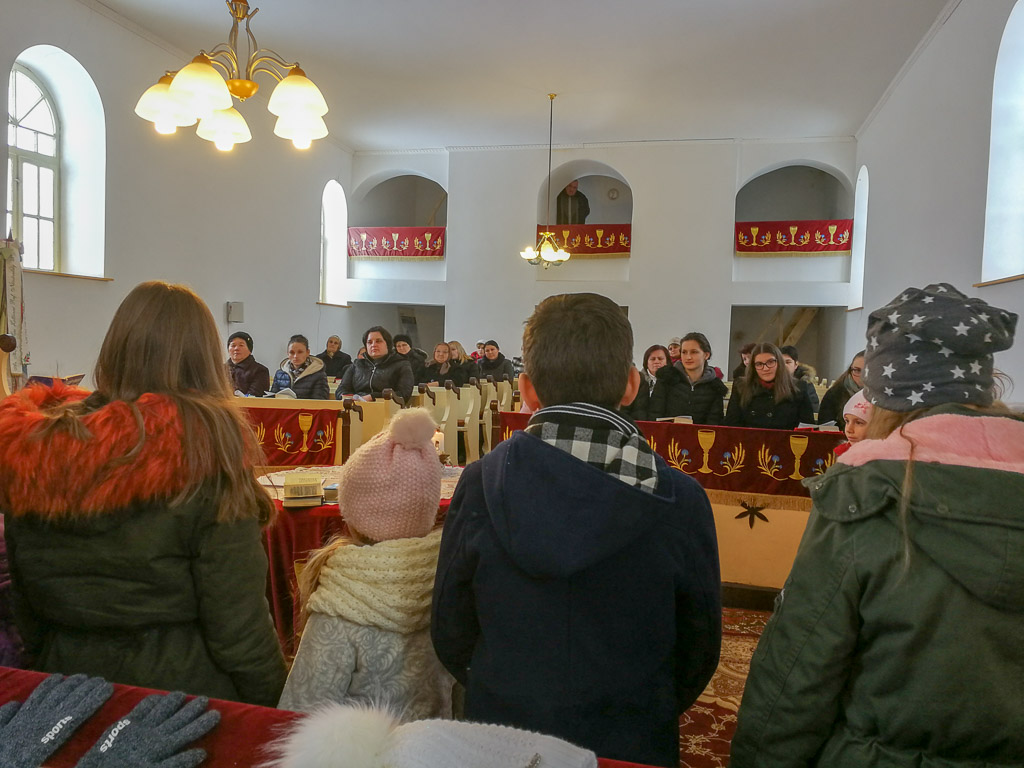 December 16-án hóesésben indultunk útra, hogy az irinyi gyerekekkel és szüleikkel töltsük advent harmadik vasárnapját. A kicsik és nagyok egyaránt készültek erre a napra dalokkal és köszöntőkkel – ezeket novemberben megtanítottuk és kiosztottuk nekik. Az istentiszteletet követően elénekeltük azokat, majd Jókai Mór Melyiket a kilenc közül? című novelláját is megismerhette a gyülekezet. A történetben felcsendülő Krisztus urunknak áldott születésén kezdetű énekkel közösen vártuk a közelgő ünnepet. Mindannyian együtt énekeltünk, majd a gyerekek az általuk készített karácsonyfadíszekkel lepték meg szüleiket. Ezt követően mi is átadtuk az ajándékokat, s a mosolygós arcocskák örömmel töltöttek el bennünket.