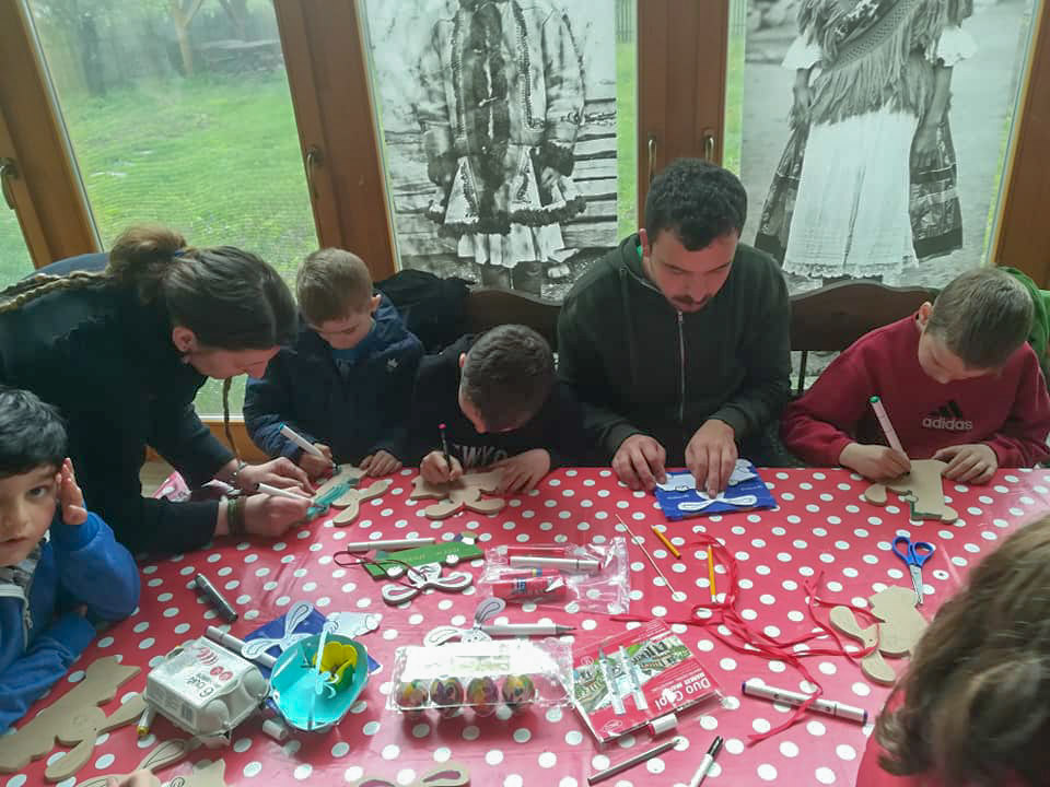 Az áprilisi foglalkozásunkon a Várasfenesi Tájházba a fenesi, körösjánosfalvi, belényessonkolyosi és belényesi gyerekek mellett – nagy örömünkre – a belényesújlaki gyerekek is átjöttek, rajtuk kívül pedig Kisnyégerfalváról is jöttek gyermekek. Nagyon jó érzés volt, hogy a Belényesi-medence szinte minden magyarlakta településéről voltak fiatalok, akik a közös munka és játék közben ismerkedhettek egymással.