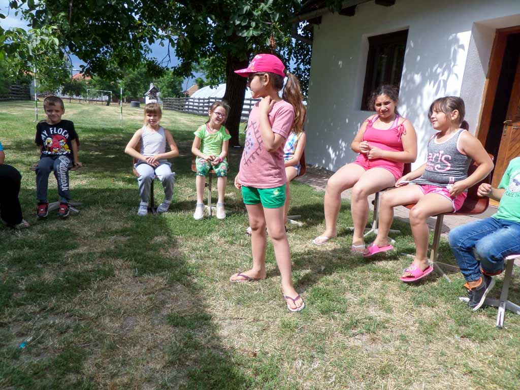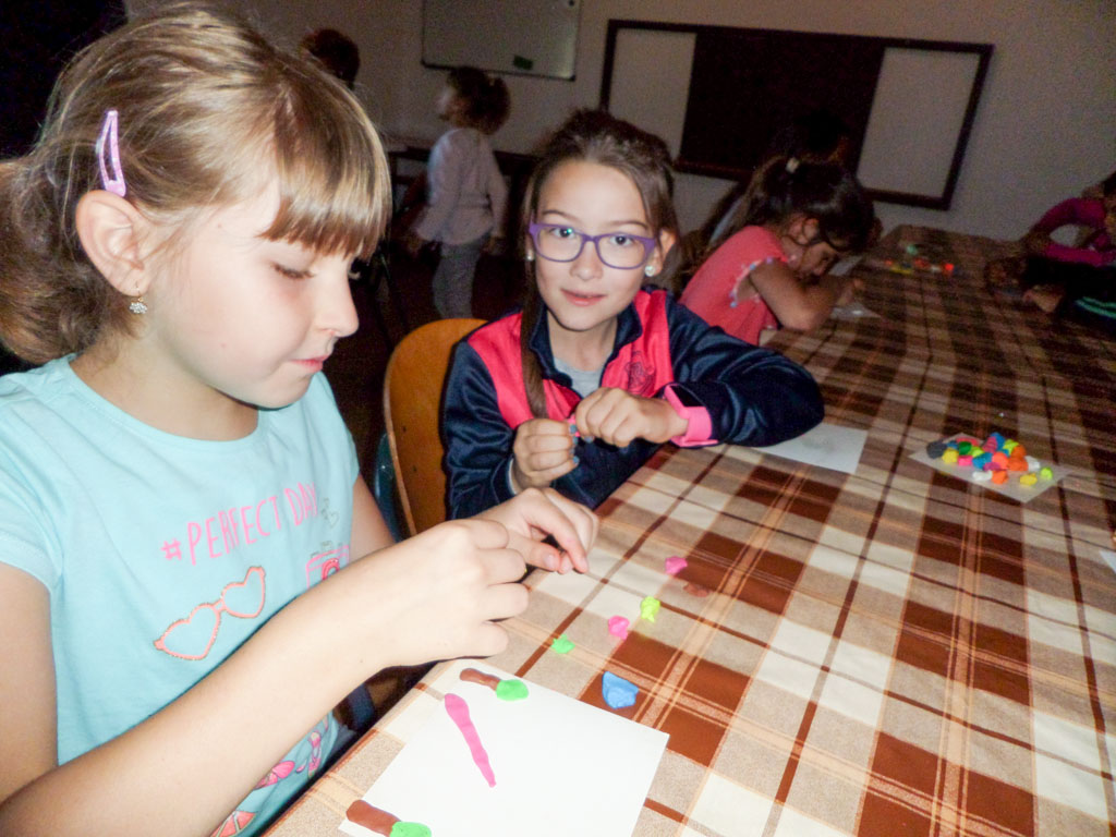Pénteken délelőtt gyurmaszobrok készítésével foglalkoztunk, és megbeszéltük, hogy kiállítást rendezünk az elkészített darabokból. Sajnos a tábor egész ideje alatt esett az eső, emiatt a szabadba tervezett programok módosultak, és filmvetítést tartottunk a sportversenyek helyett.