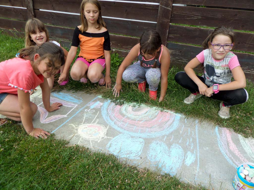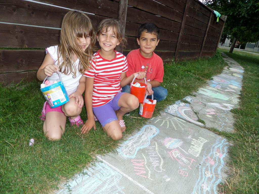 Szombaton délelőtt aszfaltrajzversenyt szerveztünk, és Daróczi Ilona tanárnő egy új technikát is kipróbált, ami abból állt, hogy rajzokat átmásoltak fóliára, a kivágás után “kisütötték, majd bőrszíjra felfűzve szép nyakláncokat tudhattak magukénak a táborozók. Délután Nagyváradra ment a csapat a Gyermekvárosba, ahol a szabadtéri játék szintén rövid ideig tartott a nyakunkba zúduló égi áldás miatt.