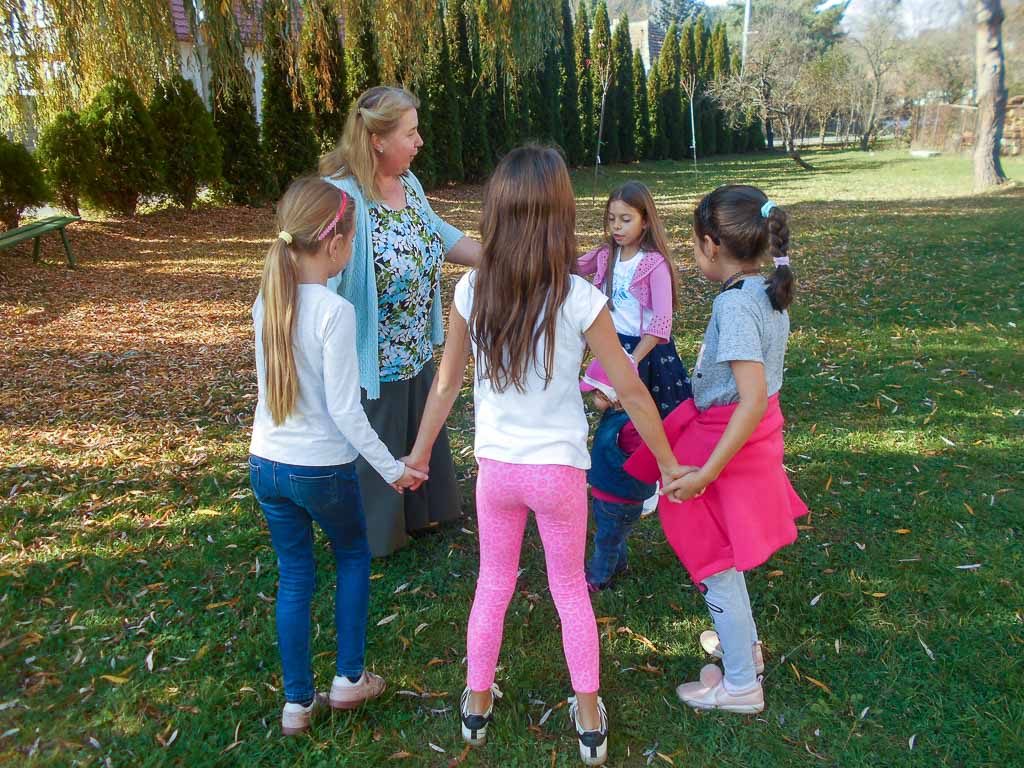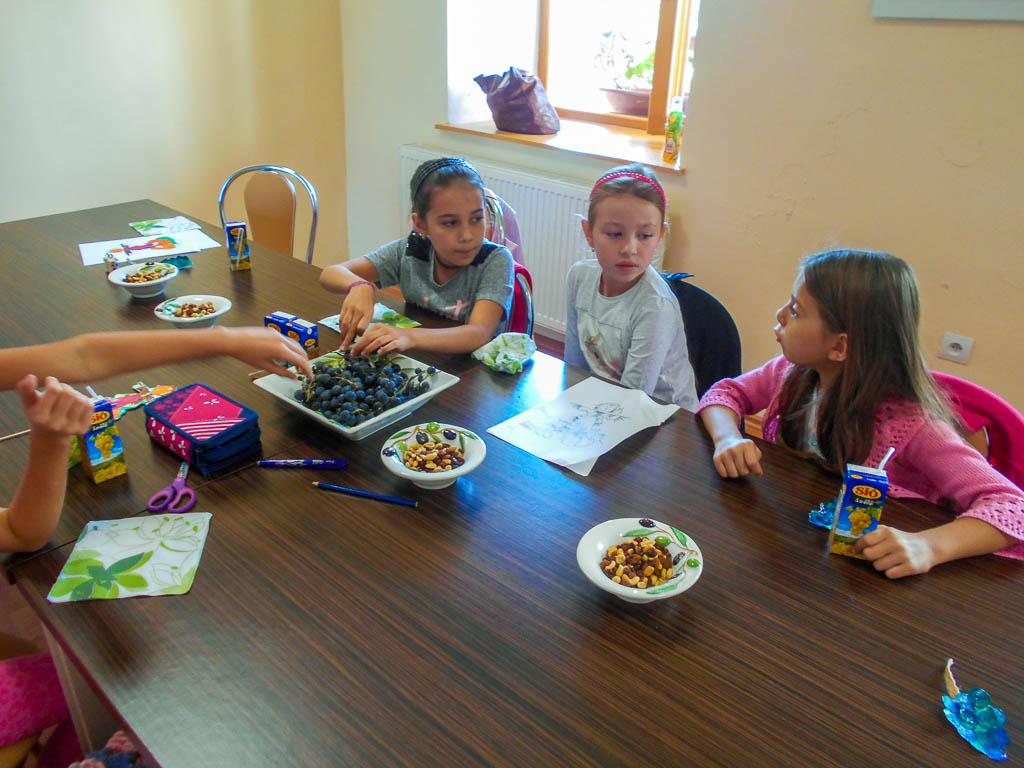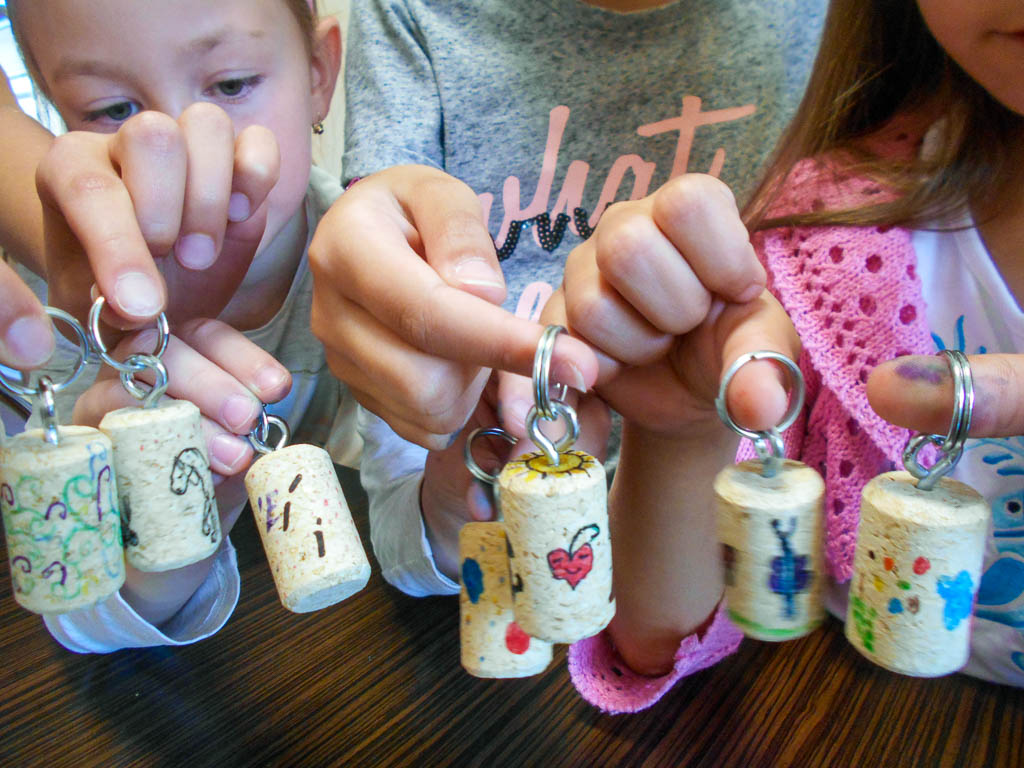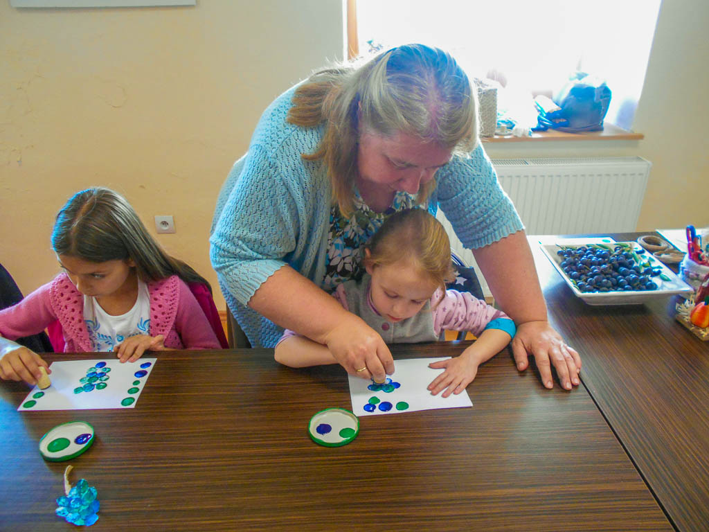 Tanítottam népdalokat, alig várták, hogy a kézműveskedés után táncoljunk is. Ezúttal parafadugóból kulcstartót készítettünk, szintén dugóval szőlőfürtöt nyomdáztak a gyerekek, amiből hűtőmágnes vagy könyvjelző lehetett, végül kiszíneztek egy madárijesztőt ábrázoló lapot, s aki akarta, bábot csinálhatott belőle. A kínálni való szőlőlé és mazsolás diákcsemege volt.