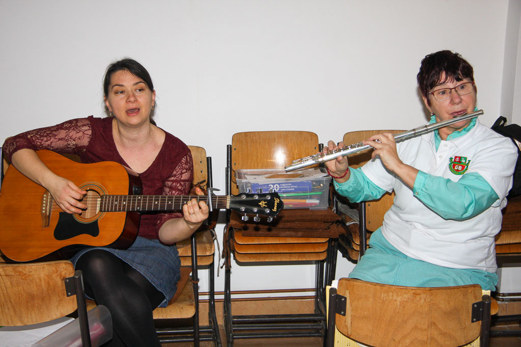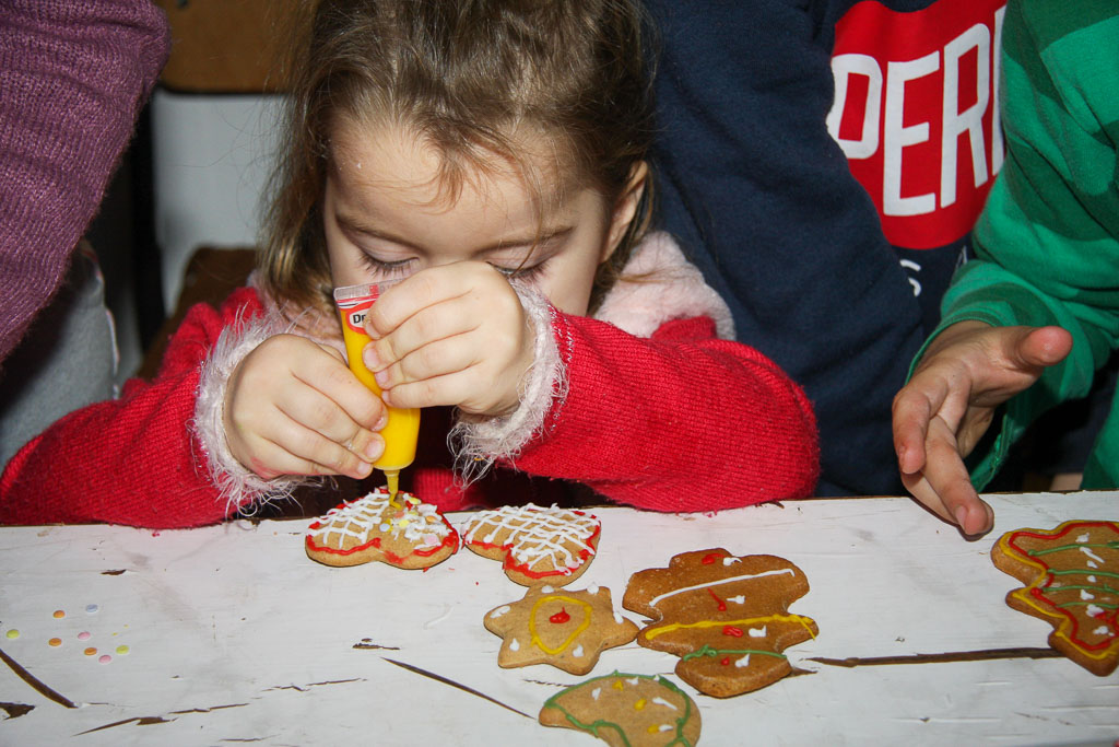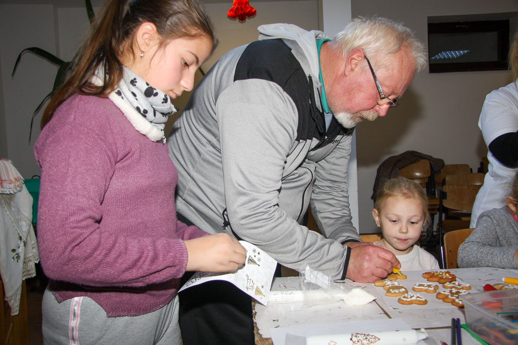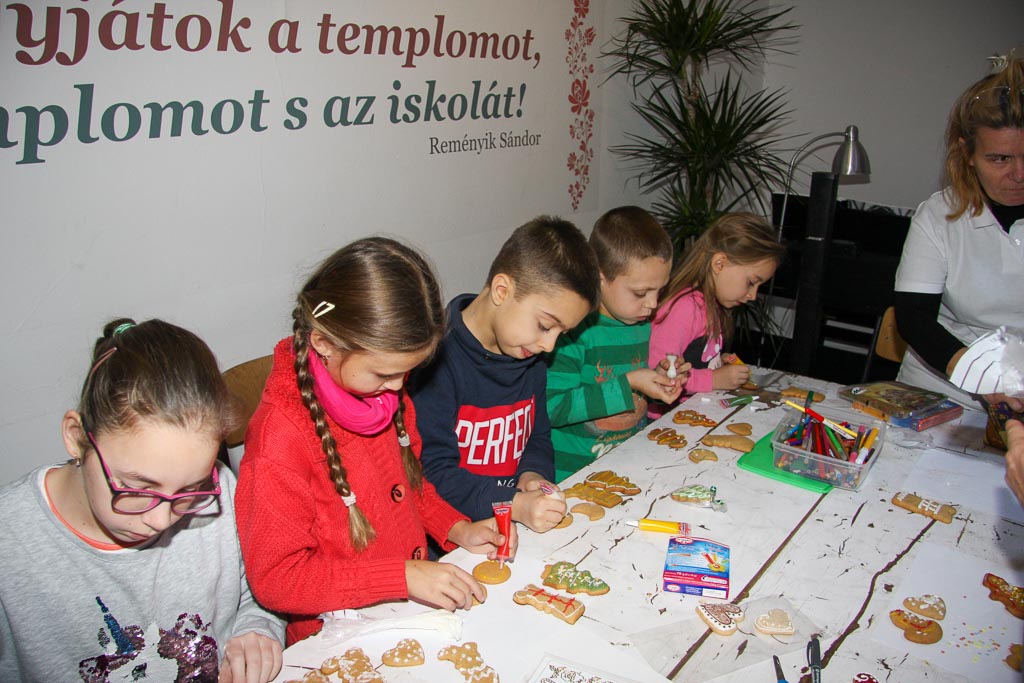 A decemberi foglalkozáson az együttlét örömét hangsúlyoztuk ki. Karácsonyi dalokat énekeltünk, amelyeket Demeter Márta tiszteletes asszony gitárral és Lőrinczy Tünde fuvolával kísértek. Az óvodások és az iskolások egymás mellett készíthették el a kézműves tárgyaikat, ugyanis arra törekedtünk, hogy a két korosztály együtt legyen. Készítettünk karácsonyi gömböt, díszítettünk üveg mécsestartót és mézeskalácsot, melyből közben falatoztak a gyermekek. A kisebbek a nagyobbakkal együtt gyertyákat is díszítettek.
