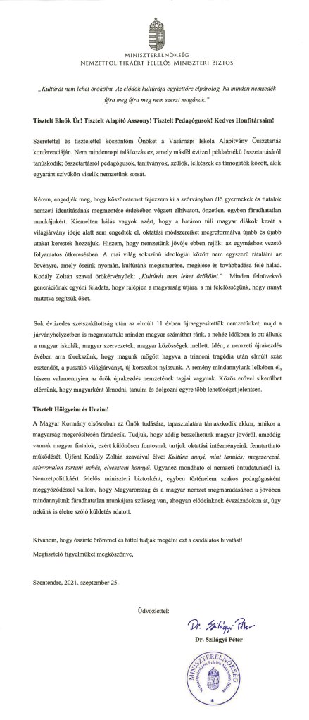 Szilágyi Péter miniszteri biztos úr idén levélben köszöntötte az egybegyűlteket, méltatta szórványmentő munkájukat, amely a járvány idején sem szünetel.