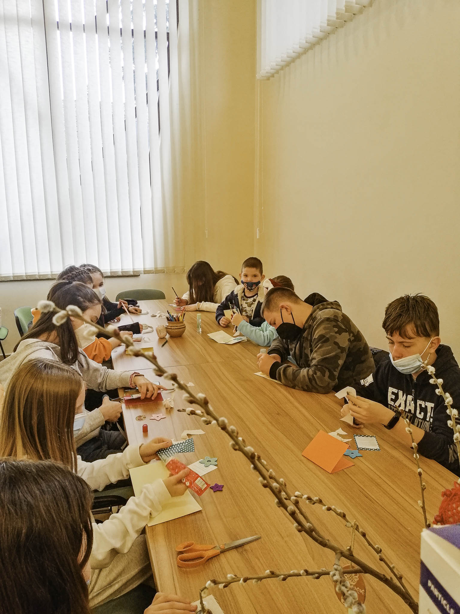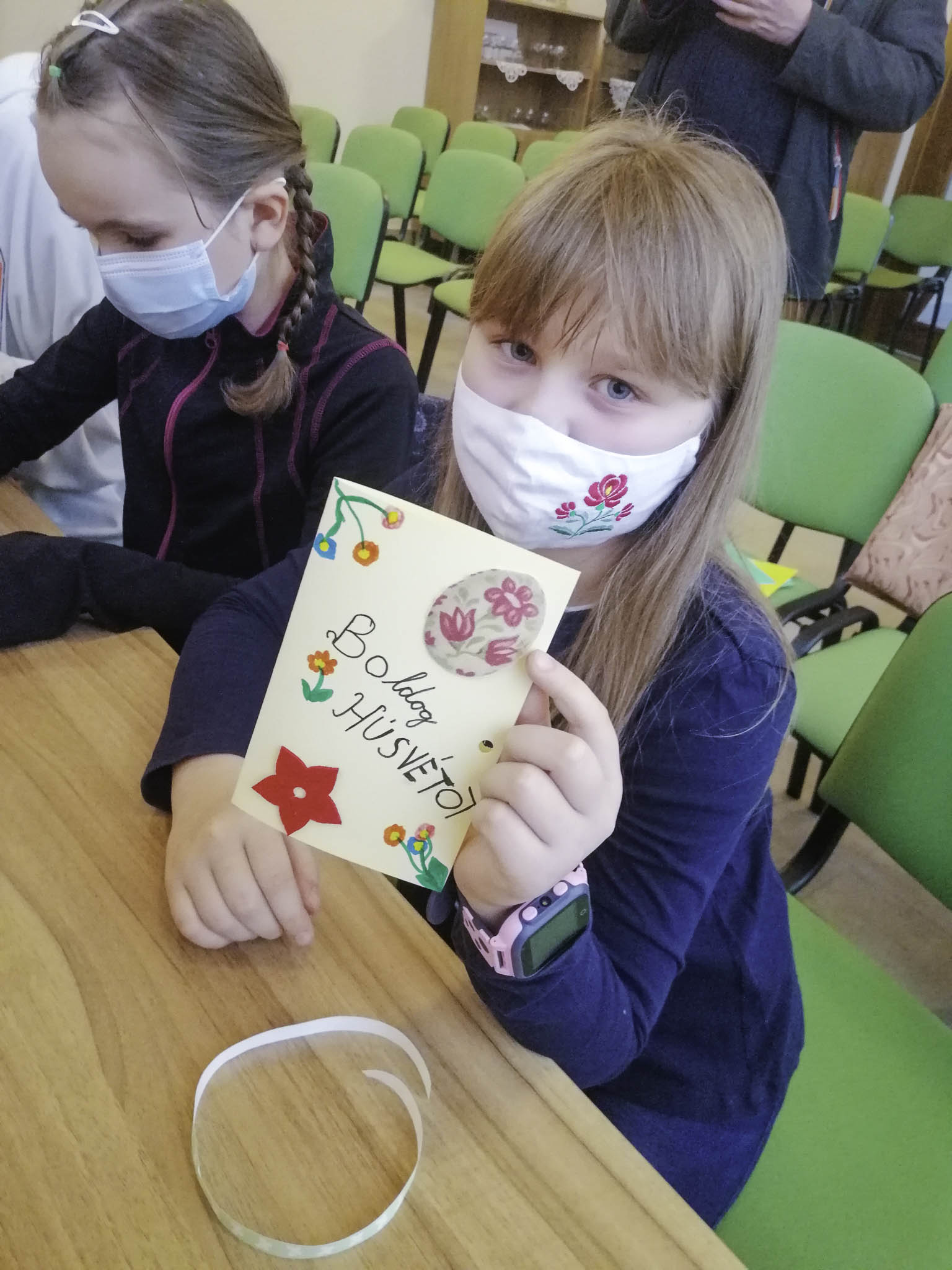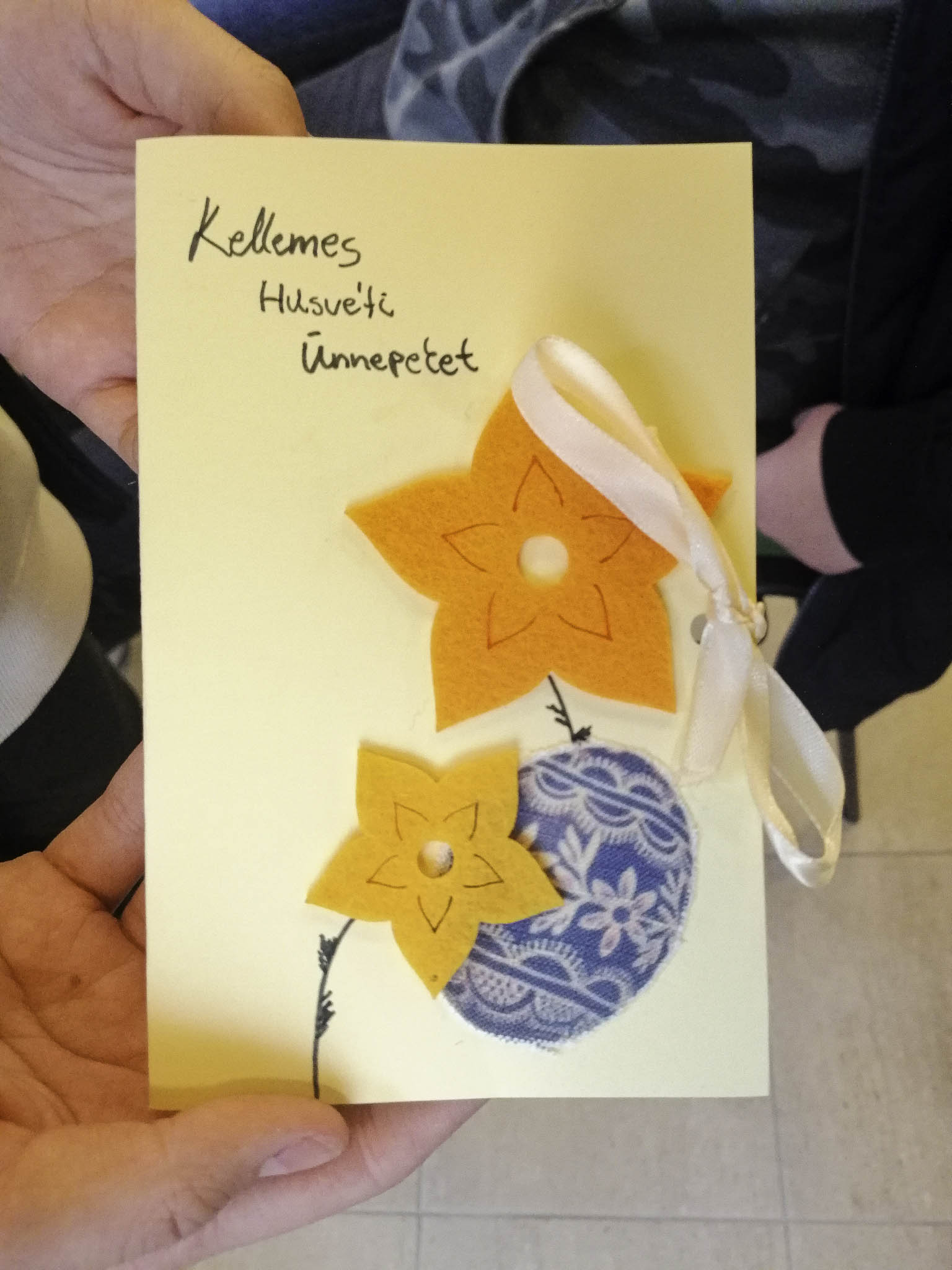A bibliai történeten túl meséltem a gyerekeknek a húsvéti hagyományokról, szokásokról. Ezekhez kapcsolódóan énekeltem nekik, de a daltanítás egyelőre nem jött össze, ugyanis annyira – érthetően – még nem tudtak feloldódni. Várható volt, hogy a legnagyobb sikere a kézműves foglalkozásnak lesz. Húsvéti asztali dekorációt, üdvözlőlapot készítettek. Megörültek nagyon a csokinyuszinak, és az apró húsvéti figuráknak, amelyeket ajándékba kaptak.