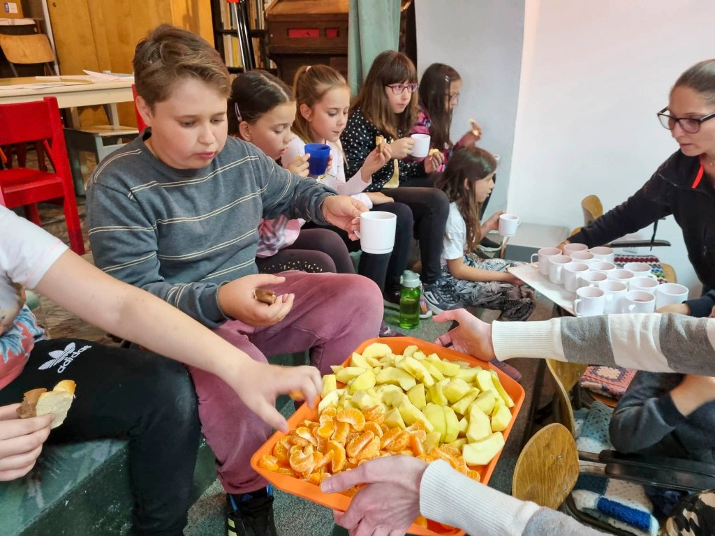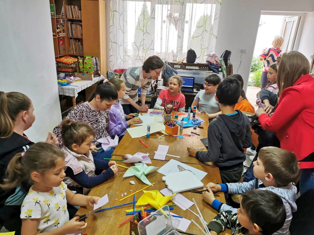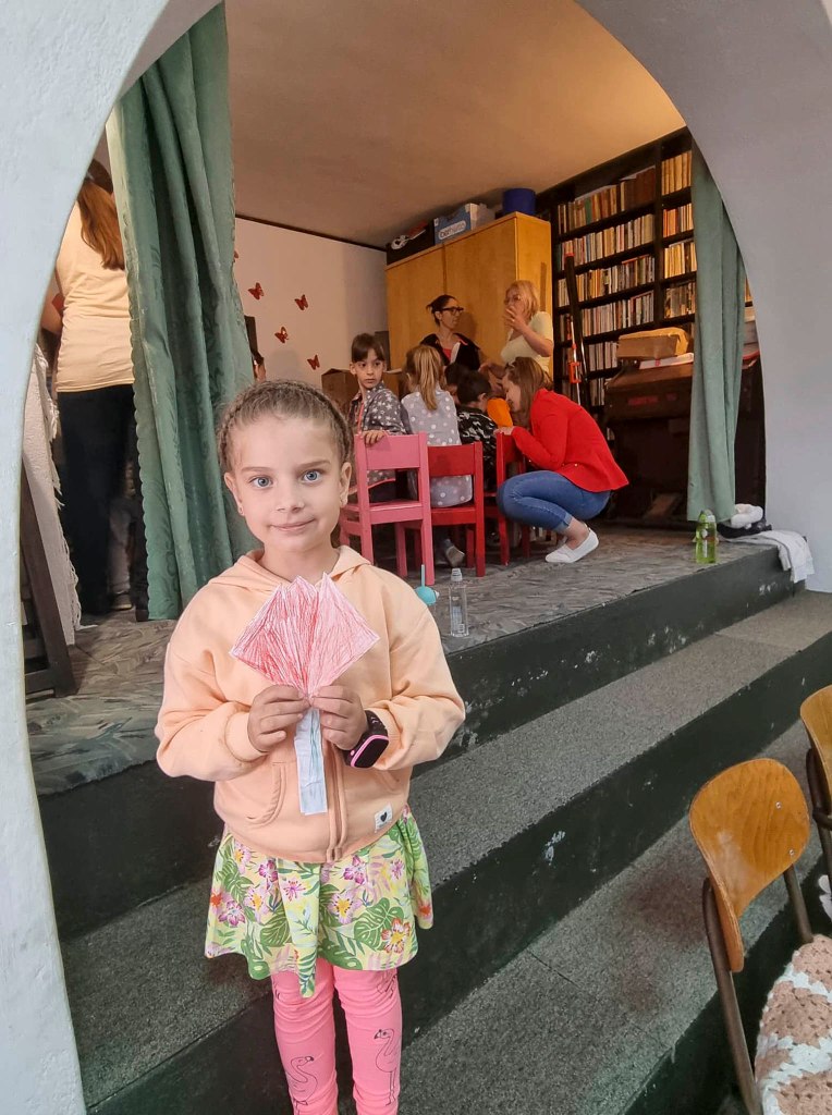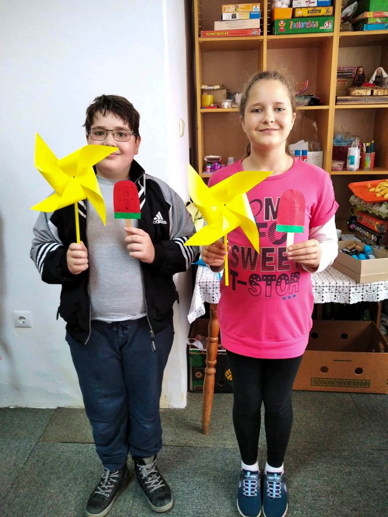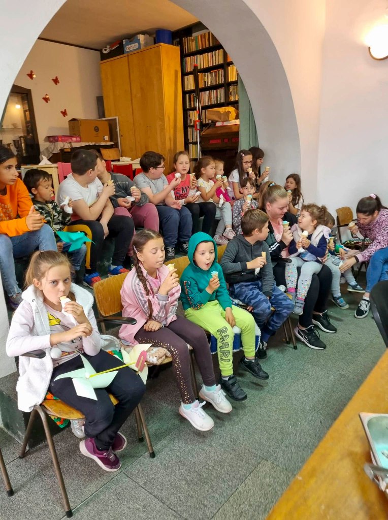 A foglalkozáson 30 gyerek vett részt. Az égig érő fa című mesét dolgoztuk fel, amit projektorral vetítettünk ki. Olvastunk a gyerekekkel közösen, majd a nagyobbak a mesével kapcsolatos feladatlapokat töltöttek ki, míg a kisebbek rajzoltak. A szabadtéri játékok után kézműves foglalkozásokkal zártuk a napot. Sok szép alkotás született: szélforgót, papírból fagyikelyhet, jégkrémet készítettek a gyerekek. A közelgő gyereknap apropójaként igazi fagyival ajándékoztuk meg a résztvevőket: kézműves fagylaltot vittünk, aminek nagy sikere volt.