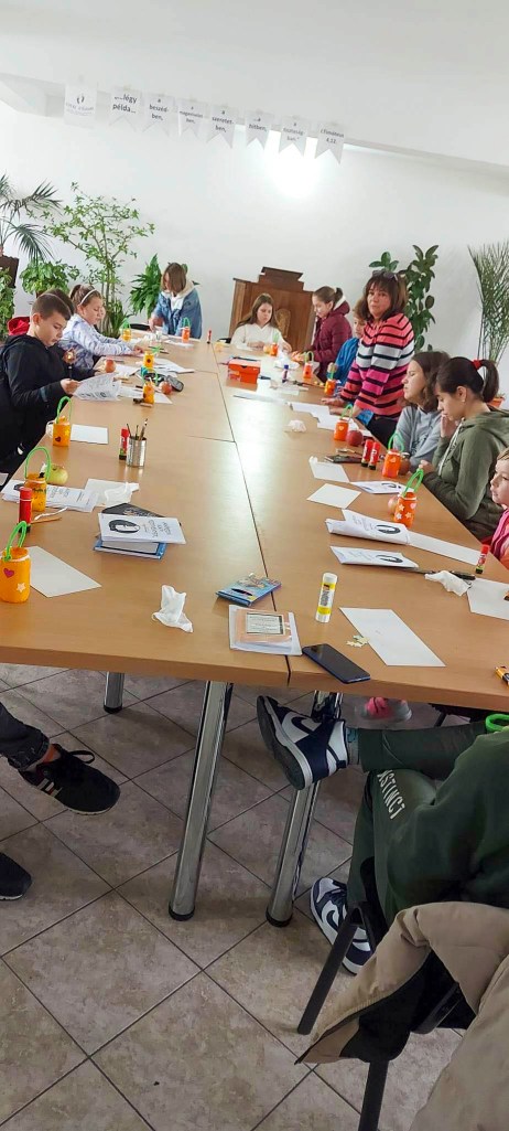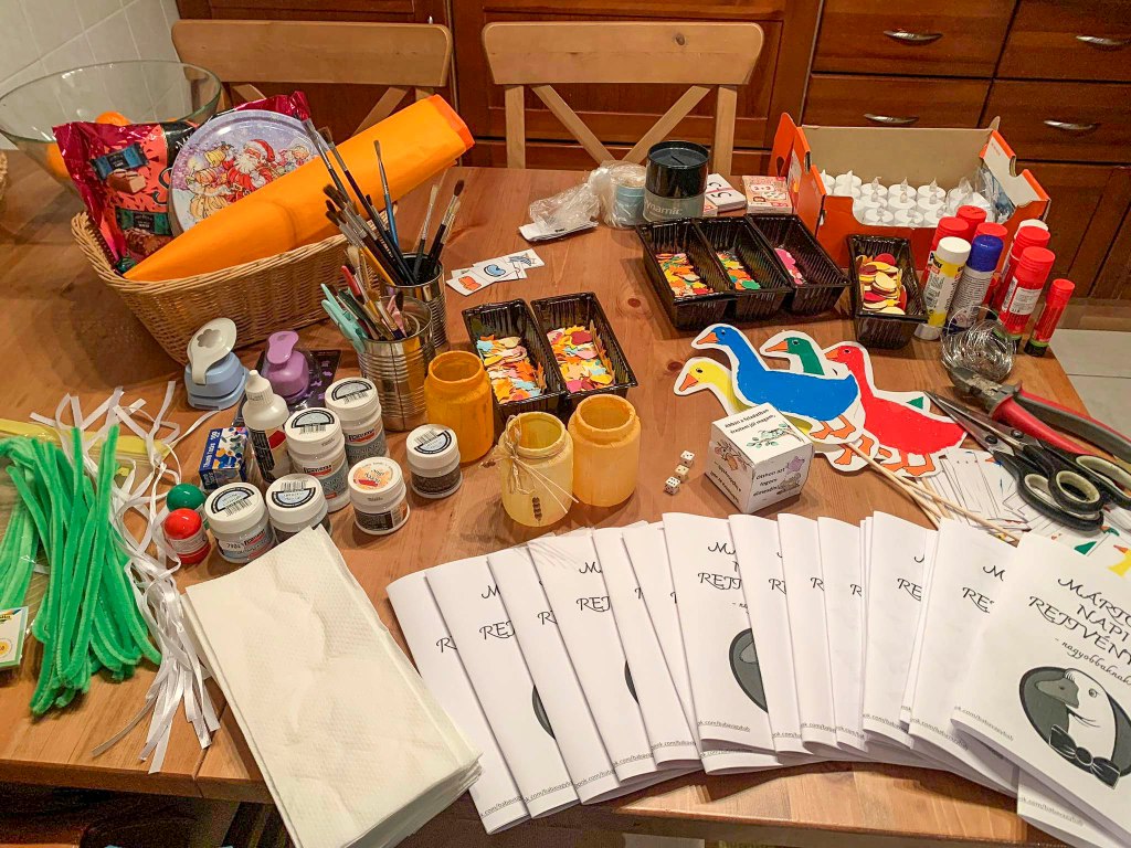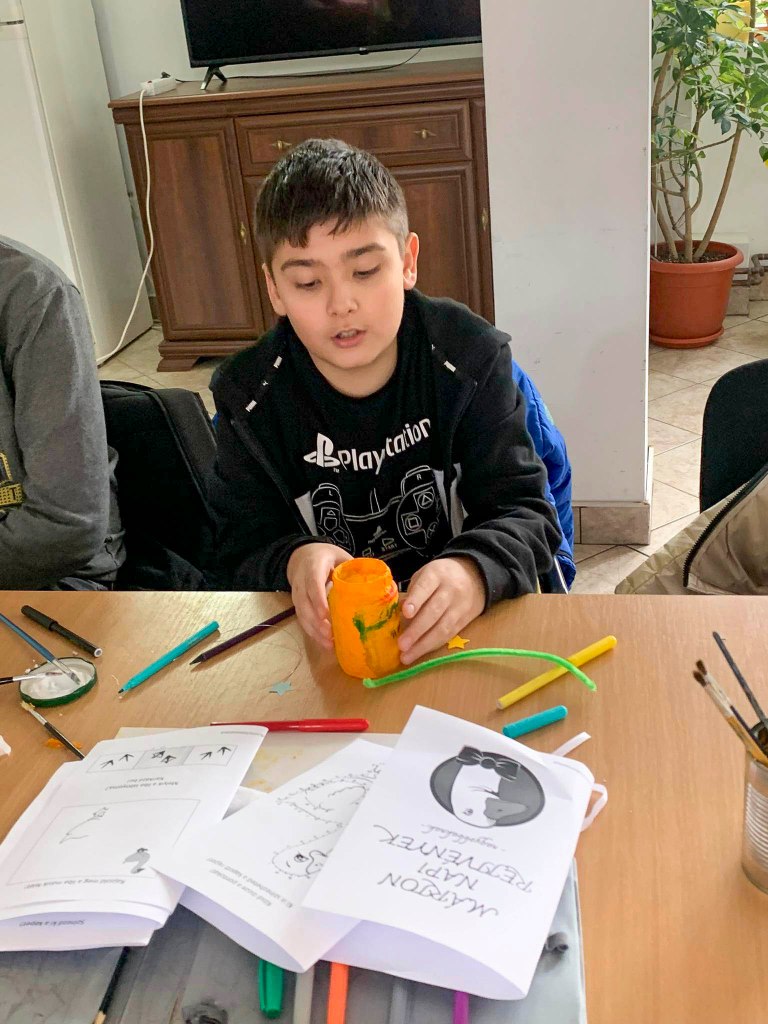 A szokásunktól eltérően a „barkács” foglalkozással kezdtünk, ahogy ők nevezik a kézműveskedést. Erre azért volt szükség, mert dekopázsoltunk, és annak bizony száradni is kellett egy kicsit. A lámpások elkészítése után felidéztük Márton püspök legendáját és történetét. Feladatlapot is kaptak a gyerekek, melyben a történetet kellett időrendbe rakni, árnyékokat kellet párosítani a megfelelő libákhoz, valamint mandalás színező is helyet kapott a füzetben. Nem mondtunk le a versekről, mondókákról és rejtvényekről sem. (Sajnos csak két lány tud magyarul olvasni.) Megtanultuk a „Száz liba egy sorban” kezdetű dalt, és az elkészült lámpásokkal egy vidám felvonulást szerveztünk. A népszokásokról beszélgettünk a foglalkozás végén, majd a jól megérdemelt édességet és egy mosolygós almát kaptak a gyerekek.