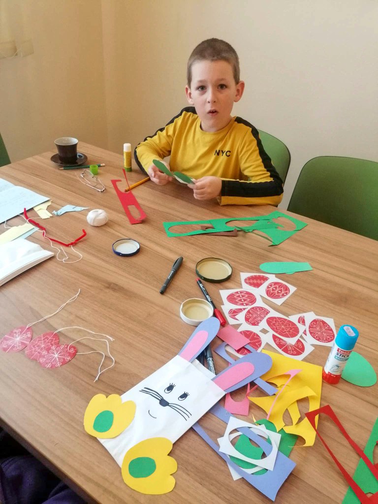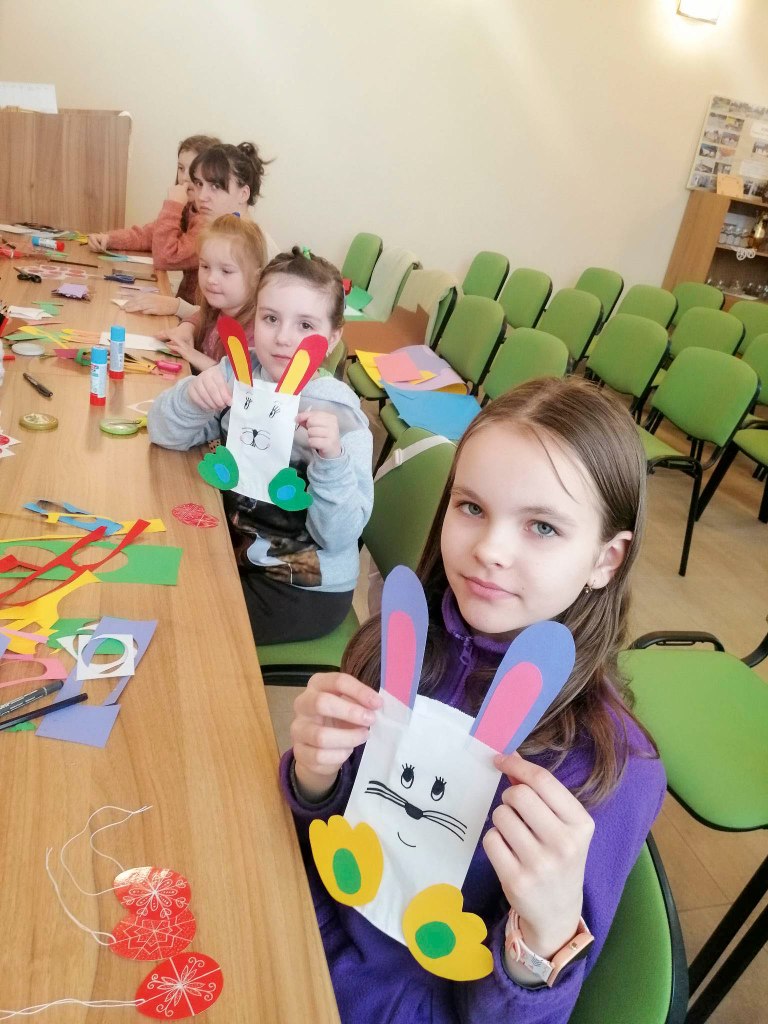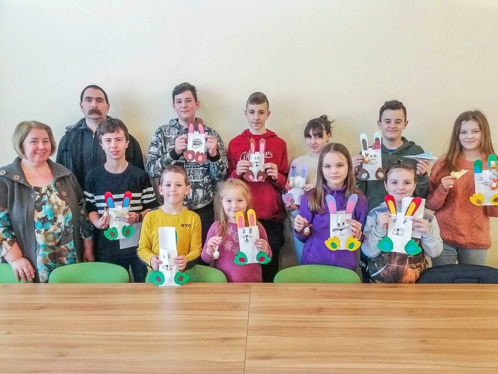 Virágvasárnap előtti szombaton tartottuk a húsvéti foglalkozást Komarócon. A nagyhét és a húsvét főbb eseményeiről beszélgettünk, kitérve a népszokásokra, hagyományokra is. A kiszehajtás és a zöldágjárás szokásához énekeltünk, mondókáztunk. Papírzacskóból nyuszi készült, amibe apróbb húsvéti ajándékok, édességek kerültek. A régi hímestojások legszebb mintáit is felidéztük, majd tavaszi madárkát hajtogattunk. A fiúknak locsolóvers-válogatással könnyítettük meg a készületet.