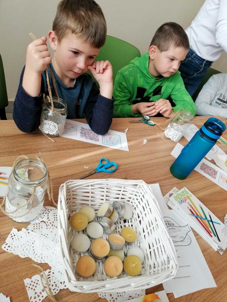 Az aranylúd című magyar népmese hallgatása közben színezésre volt lehetőség, majd Szent Márton életútját, a hozzá kapcsolódó legendát és szokásokat ismertettem. Több libás dal eléneklése, megtanulása után lámpást készítettünk. A szólások, közmondások, Márton-napi időjóslások magyarázata sem maradt el, és jókat derültünk a nyelvtörő gyakorlása közben.