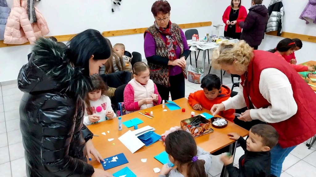 A reggeli kávézás után Béla bácsi, Bandi bácsi hathatós segítségével, levetített egy rövid filmet Jézus születéséről. Majd egy kis tízórai után a gyerekek számot adtak bibliai ismereteikről. Ezután kézműves foglalkozás keretében hangulatos karácsonyi díszek készítése következett. Végezetül közösen feldíszítettük a katolikus templom előtt álló fenyőfát.