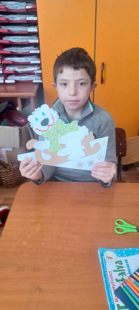 Új évet köszöntő verseket, mondókákat, dalokat tanultak a gyerekek, beszélgettünk a télről, annak szépségeiről. Ennek jegyében zajlottak a kézműves programelemek is: ablakdíszt (havas lejtőn szánkózó jegesmedve), valamint szerencsehozó malackát készítettünk, a kisebbek téli színezőkkel is foglalatoskodhattak.