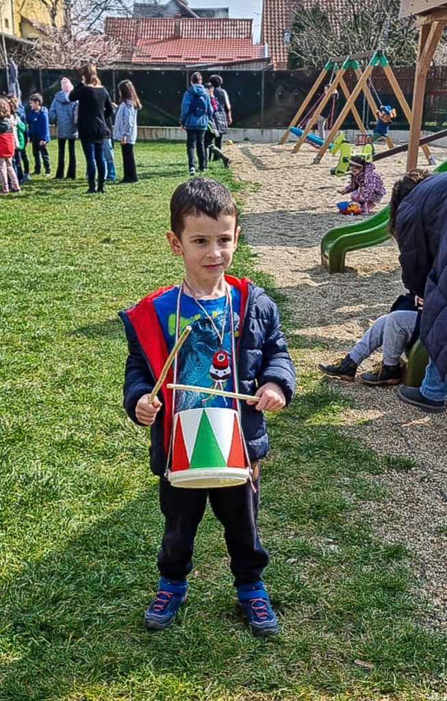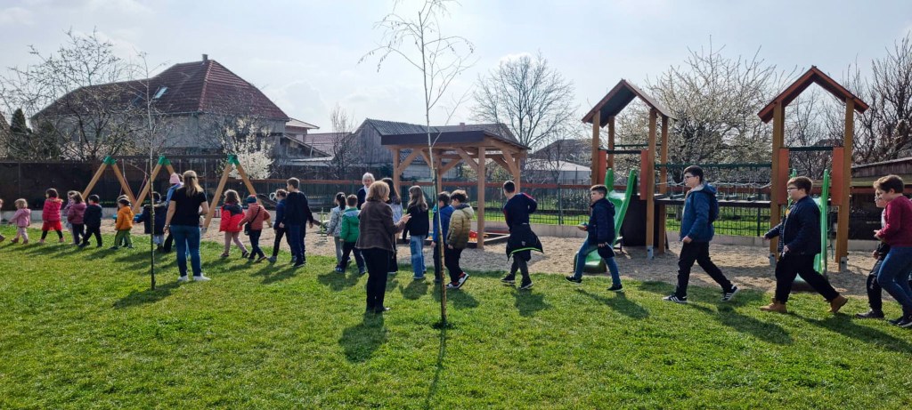 Ragyogó időjárás volt, így az ünnepi hangulatot fokozva közös felvonulással az udvaron zártuk a foglalkozásokat. Elől az óvodások dobbal, csákóval, pártával, magyar zászlókkal, hátul pedig az iskolások meneteltek a megtanult mondóka és a Kossuth nóta ütemére. Az utolsó mozzanat sorverseny volt az iskolások számára. Kellemesen elfáradtak.