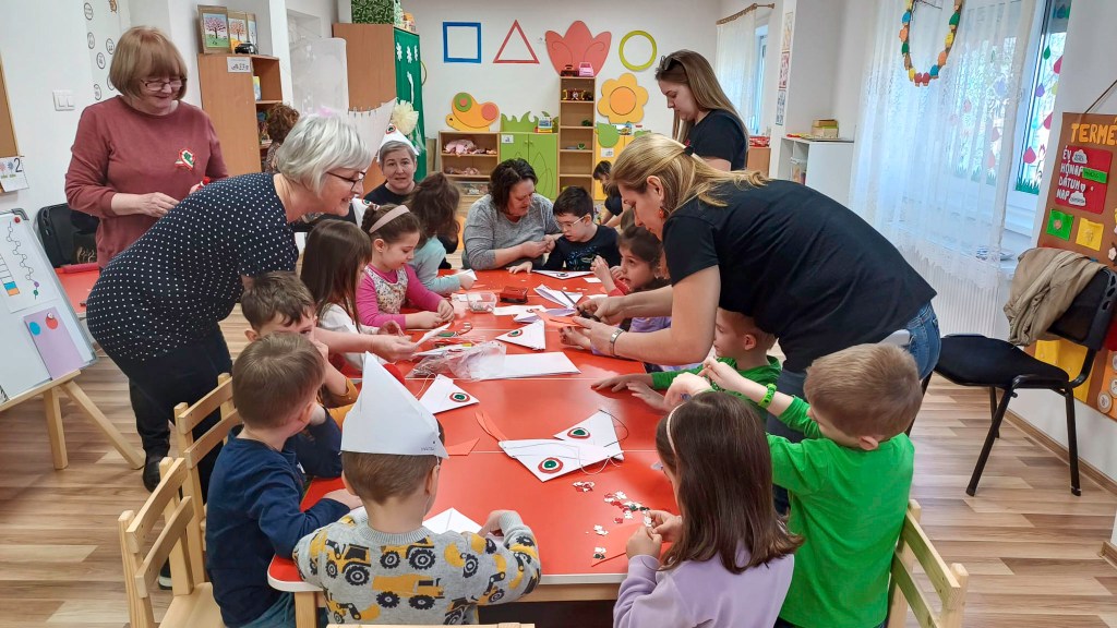 Az óvodásoknál izgalmasan kezdődött az óra, meg kellett keresniük az udvaron előzetesen elrejtett kicsi magyar zászlókat. Ezt követte a történelmi mese, majd csákókat és pártákat készítettek a sablonok segítségével. Alkotás közben megtanulták Weöres S. Megy az úton a katona c. versét. Ha valaki elfáradt dob, vagy zászló kifestővel foglalatoskodhatott. Az iskolásoknál a jeles nap eseményeit megszakítva érdekes, játékos elemekkel színesítve élhették át a nap hangulatát a gyerekek. Ezek volta a következők: