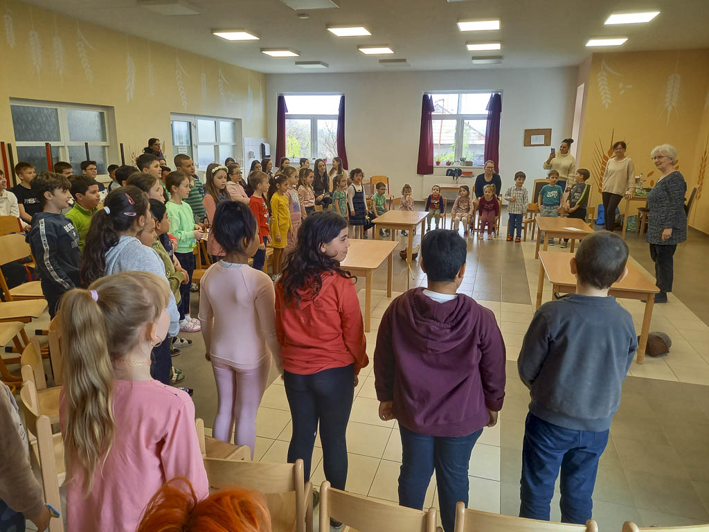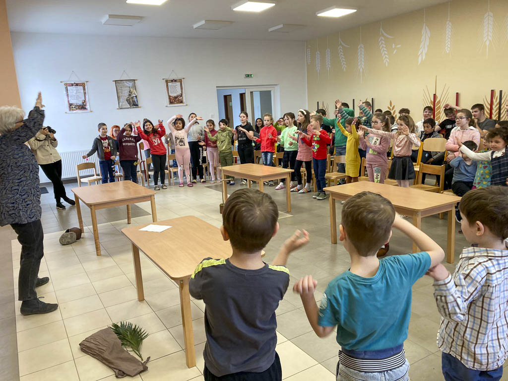 A felsőbb évfolyamosok kétféle technikával a nagyhét jelképeit jelenítették meg. Tűfilc rajzolással festéssel készült a képek egyik része és olajpasztellre fekete akrillal festett alapozás után karcolással készült a képek másik része. Rajzolás közben mód nyílt egy-egy rövidebb személyes beszélgetésre. A foglalkozás közös imádsággal ért véget. Öröm volt hallgatni, hogy a gyermekek hangja betöltötte a helyiséget.