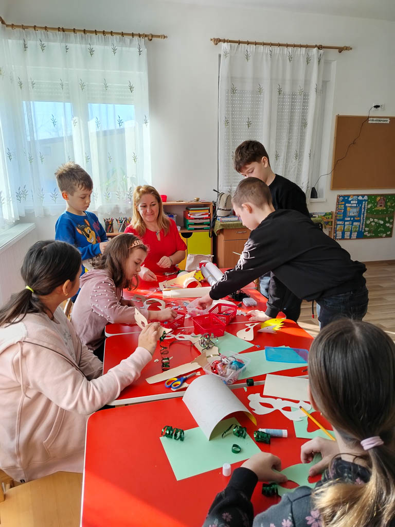 Az iskolásokkal pontosítottuk a farsang időtartamát, lényegét, a hozzá kapcsolódó népszokásokat. Ezt követően, a kapott, és választott sablon segítségével mindenki elkészítette az álarcát, vagy a farsangi „szemüvegét”, és egyéniségüknek megfelelően kidíszítették azokat. Nagyon élvezték a munkát, és a farsangi dalokat, melyeket a két csoport be is mutatott egymásnak.