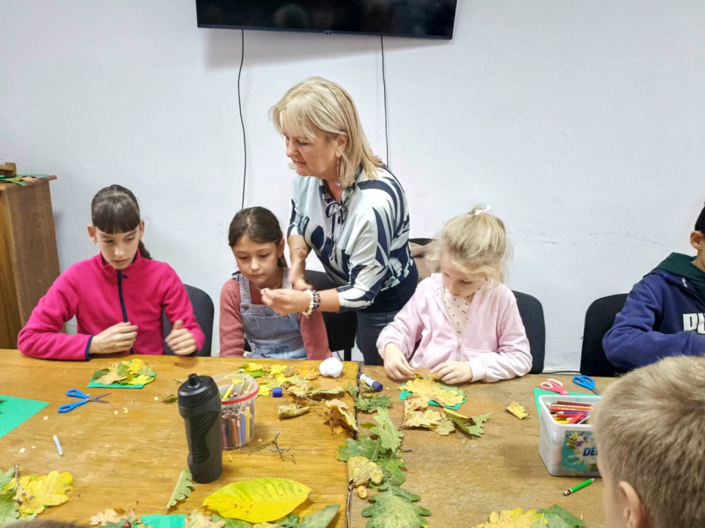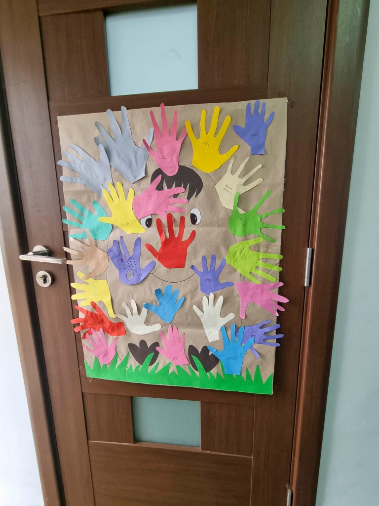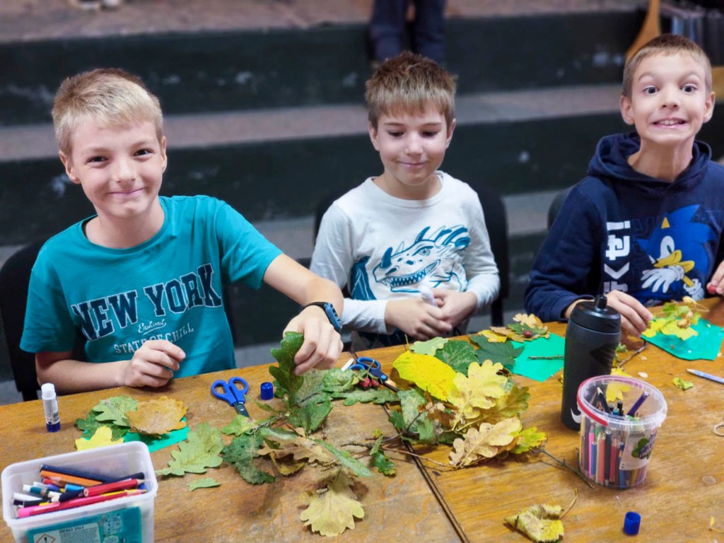 A napot kézműves foglalkozással zártuk, a gyerekek saját kezűleg készítettek ajtódíszeket (erdőben szedett falevelekből) és emléktárgyakat, amiket örömmel vihettek haza. Készült egy közös kép is, egy óriási sünit rajzoltunk, aminek a tüskéit a gyerekek saját kézlenyomatukkal díszítették, így igazi színes vidám alkotás született.