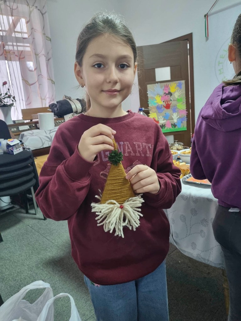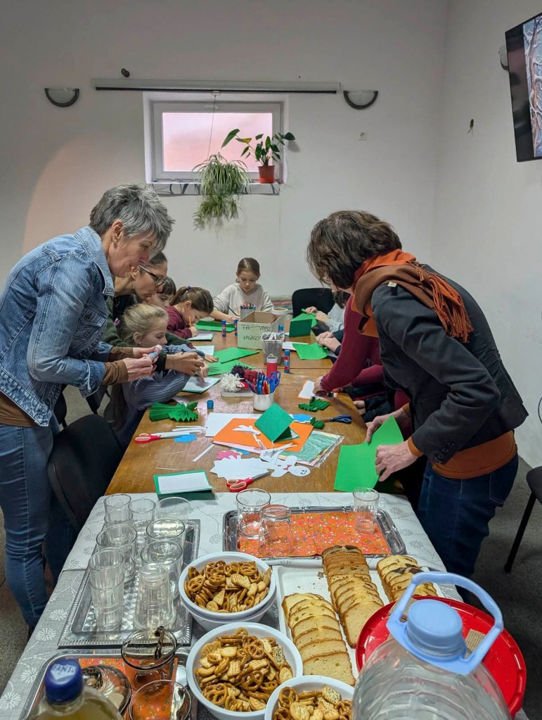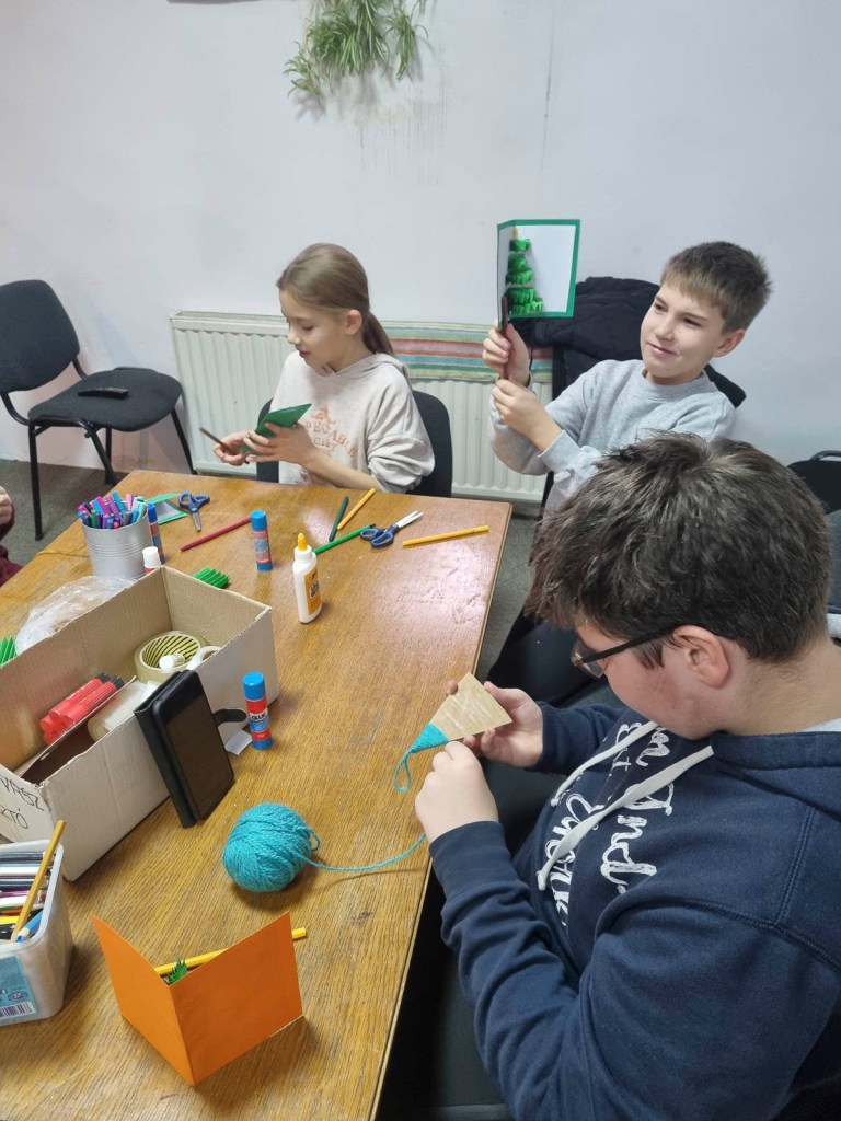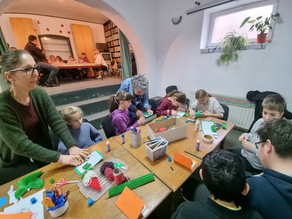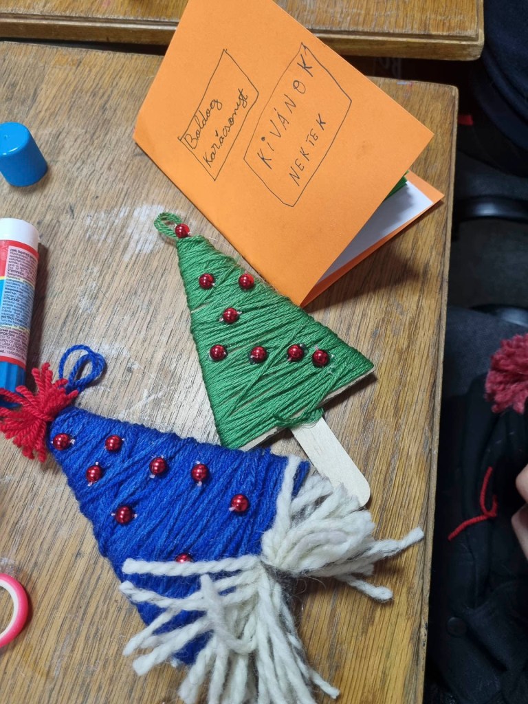 A foglalkozás második részében kézműveskedésre került sor. A gyerekek saját képeslapokat készítettek, valamint karácsonyfadíszeket alkottak, melyekkel már az ünnepre hangolódtunk együtt. A közös munka jó hangulatban telt, és szebbnél szebb alkotások születtek.