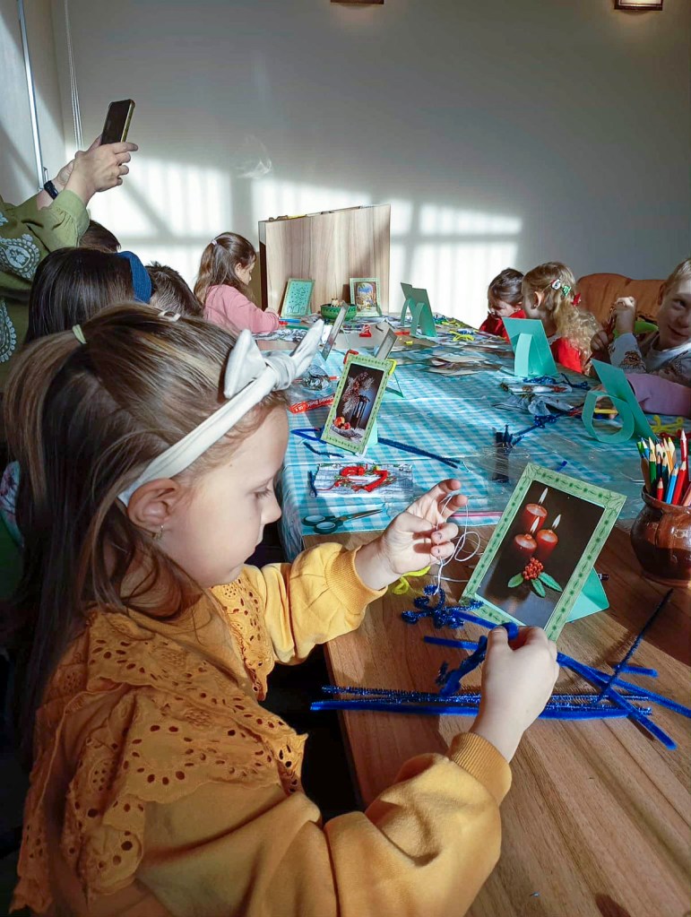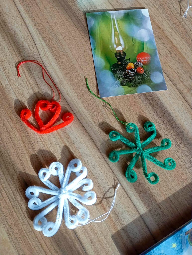 Zseníliaszálakból karácsonyi díszeket készítettünk, majd régi képeslapok újrahasznosításával képeket alkottunk.