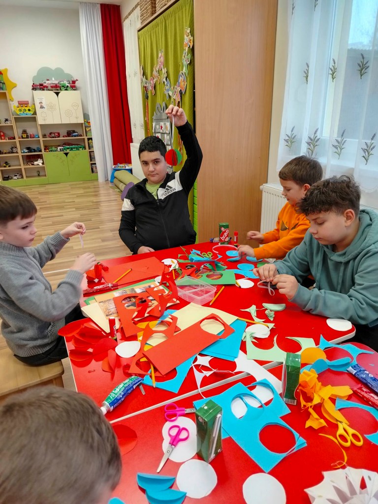 Itt a kézműveskedéssel kezdtük a foglalkozást, mert koruknál fogva náluk több időre van szükség az ilyen jellegű munkához. Már meglévő kihajtható karácsonyi képeslapba készítették el megadott minta alapján a saját képeslapjukat, melyet a családtagjaiknak adnak át.