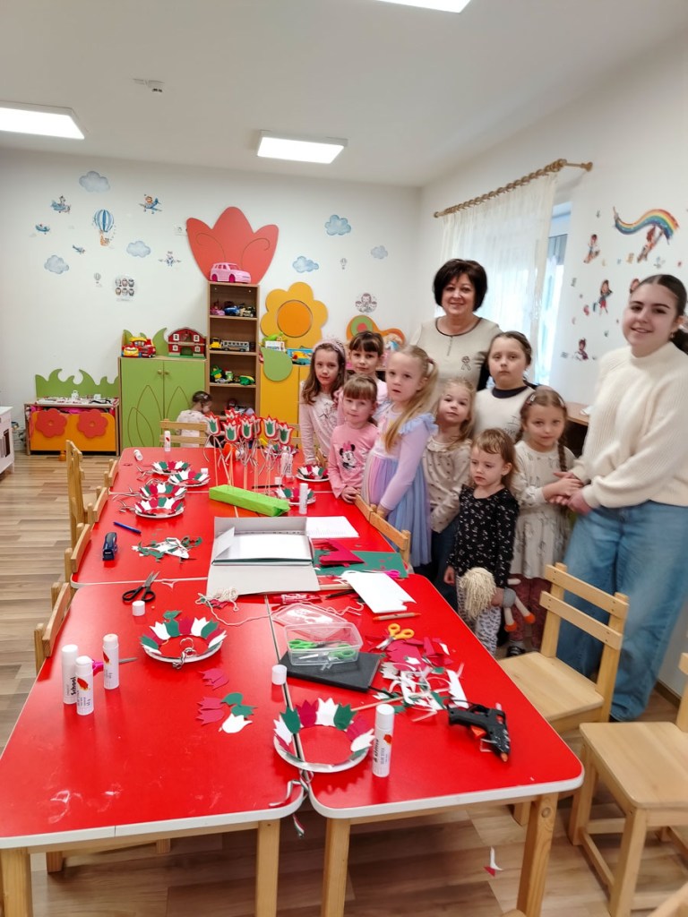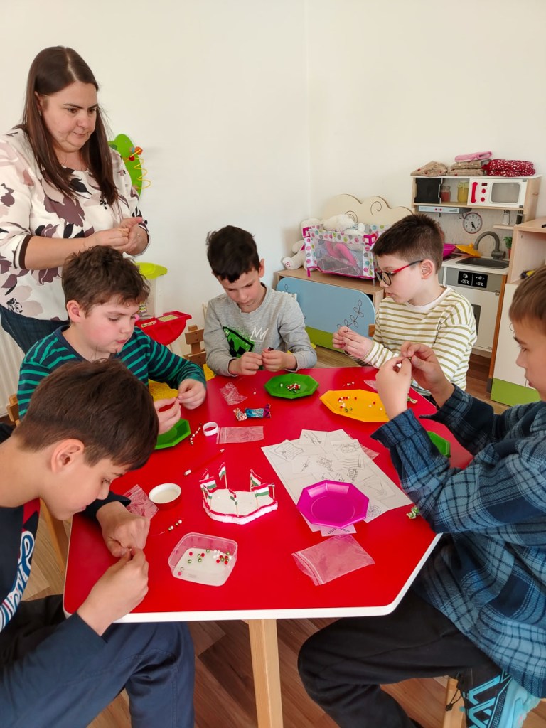 Mesés történetet felhasználva közelítettük meg a lényegét e történelmi napnak. Közben mozgásos mondókákkal – pl.: Weörös S. : Megy az úton a katona… -színesítettük a foglalkozást. Ezt követően kézműveskedés várt a gyerekekre. Nemzeti színű ajtódíszt és hurkapálcára rögzíthető tulipánokat / piros-fehér-zöld / készítettek. Dicséretesen ügyesek voltak a lányok és a fiúk. Boldogan és büszkén mutogatták a munkáikat.