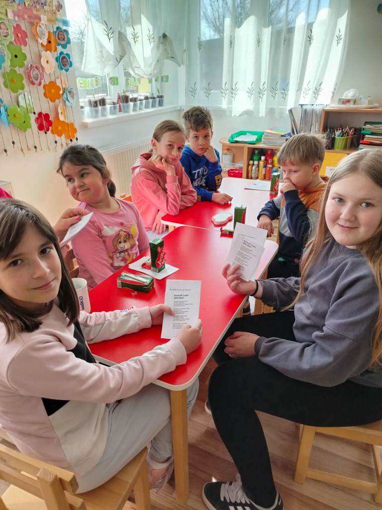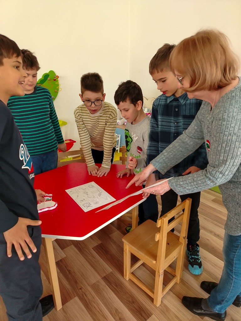 Figyelmüket ellenőrizendő, következett a több fordulóból álló szellemi vetélkedő: Verssorok helyes rendezése, képrejtvény (Petőfi, Jókai, Vasvári, Kossuth megfejtése), mozaik összerakása (kokárda), TOTÓ. Ez náluk is harcikedvet váltott ki.