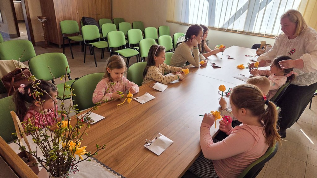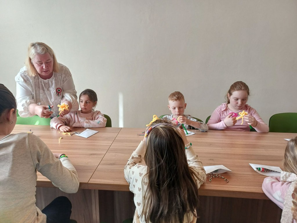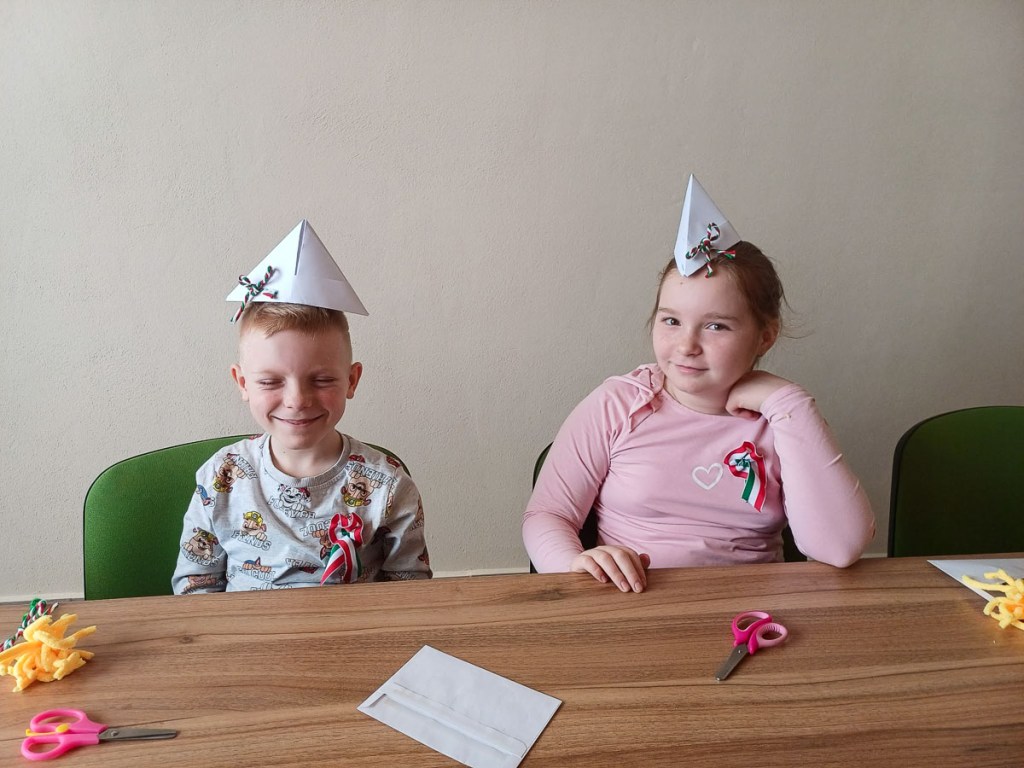 Márciusban már sikerült személyesen találkoznunk, méghozzá 14-én, így méltóképpen készülhettünk nemzeti ünnepünkre. Egy – a forradalom napját idéző – kisfilmmel és beszélgetéssel indítottunk. Virágot, kokárdát és csákót készítettünk a hősök tiszteletére. Ezeken kívül még vihettek haza nyomtatott kifestőt, szókeresőt, verset és dalokat a gyerekek, és – mivel csak húsvét után tudunk menni ismét – ajándékba csokinyuszit és -tojásokat kaptak.